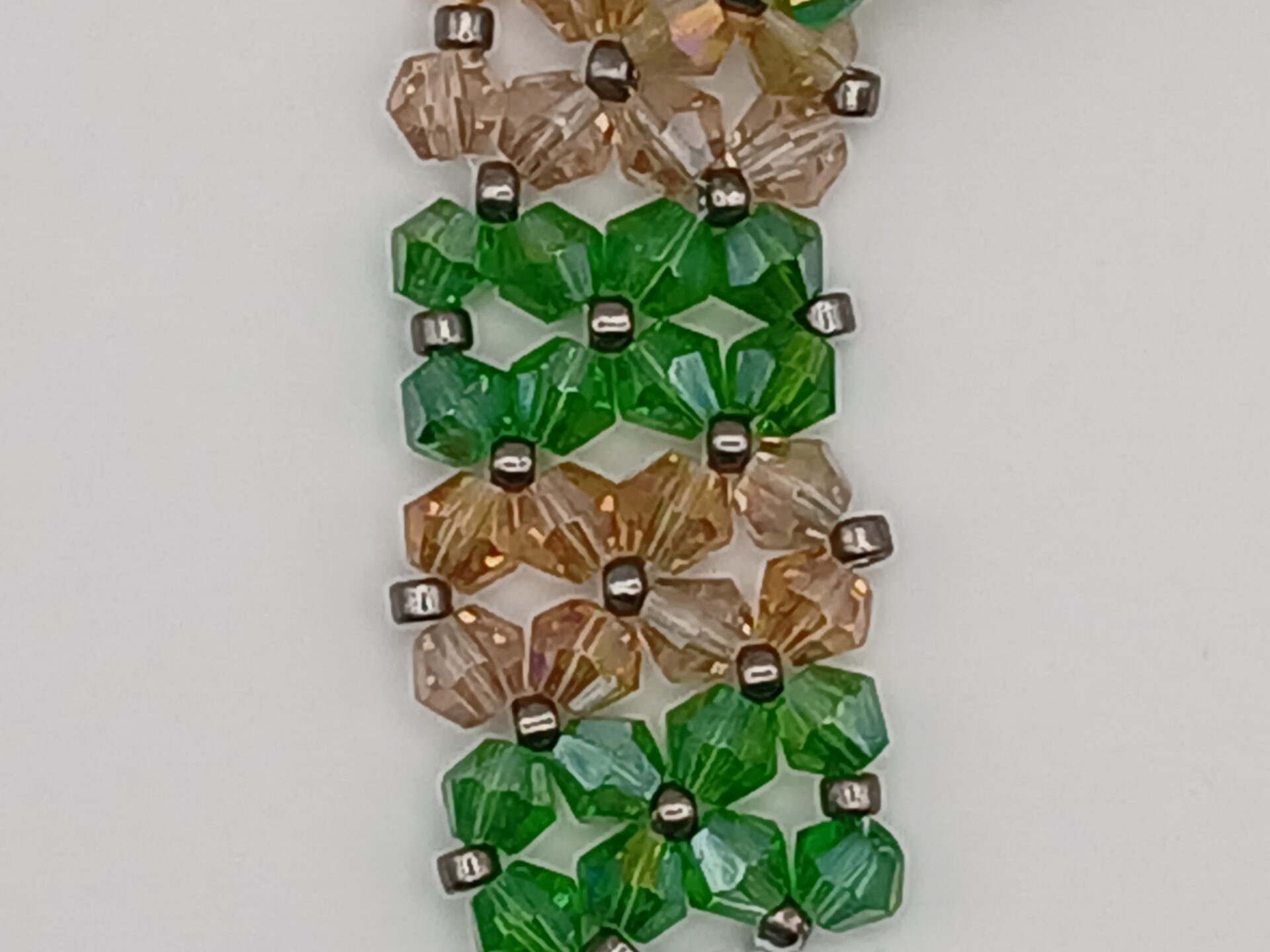 Ce bijou associe avec élégance des perles de verre vert émeraude et des teintes dorées miel, évoquant la fraîcheur des forêts et la douceur du soleil.